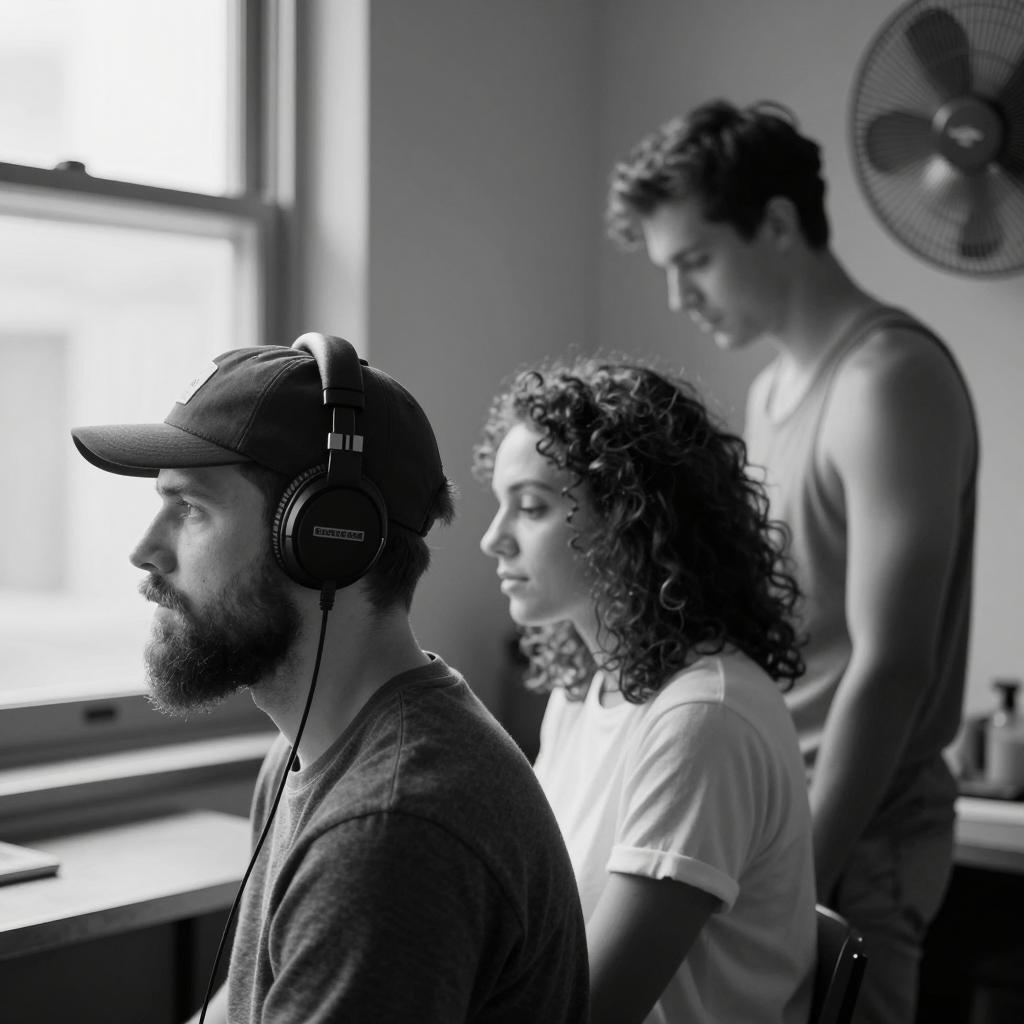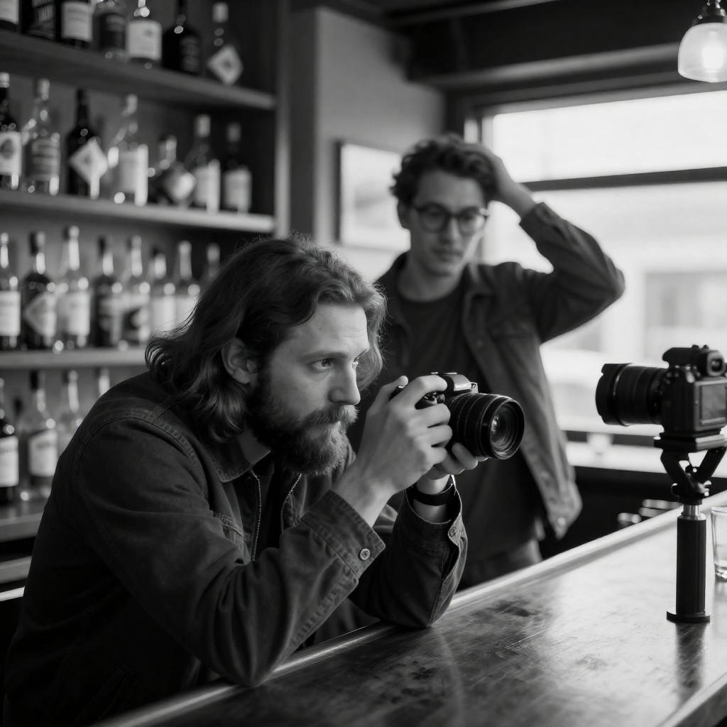 Black and white photograph of two men in a bar. Man in foreground with long hair, beard, wearing dark jacket, aiming camera. Second man in background with glasses, adjusting hair, wearing lighter jacket. Shelf with numerous liquor bottles in background. Large camera on right. Bright window behind. Man in foreground leaning forward, man in background standing.