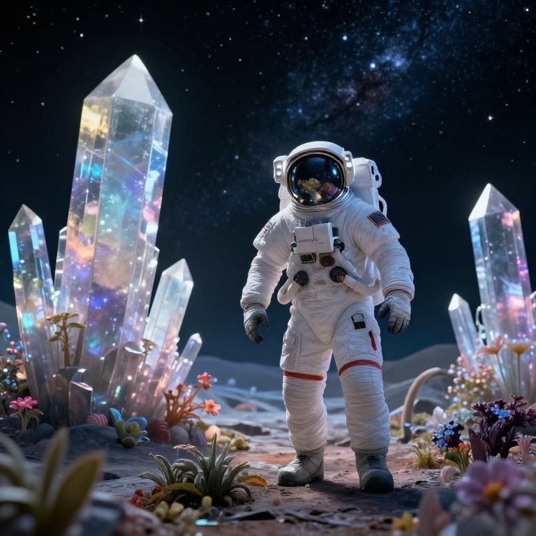 Digital artwork of an astronaut in a white spacesuit standing on a moon-like surface with glowing, crystalline structures and colorful flora. Starry galaxy in