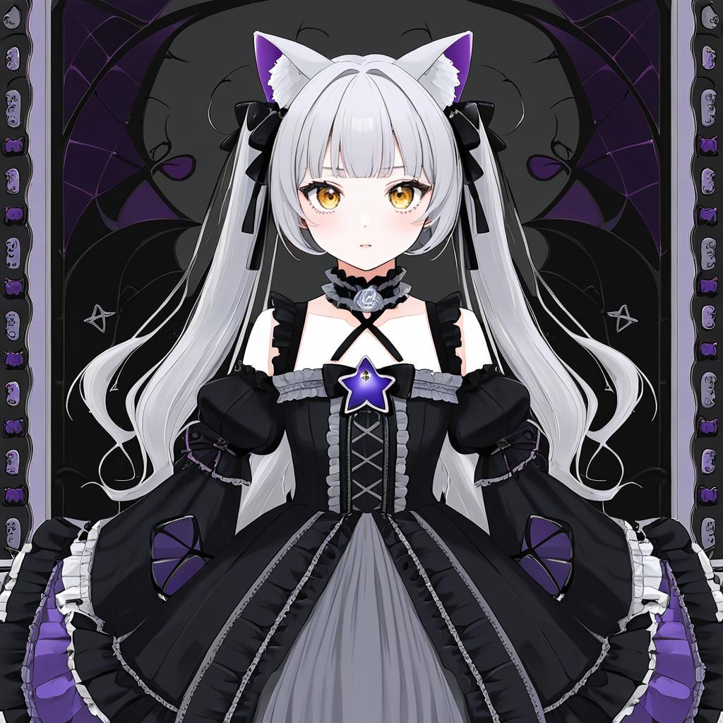 Digital anime-style drawing of a young girl with long, white hair and purple cat ears. She has golden eyes and wears a black, gothic lolita dress with lace, ribbons, and a large purple star brooch at the center. The dress has puffed sleeves and a high collar, with a black choker and lace details. The background features dark, ornate patterns with purple accents. Her expression is neutral, and her hair is adorned with black ribbons. The image has a dark, mystical atmosphere.