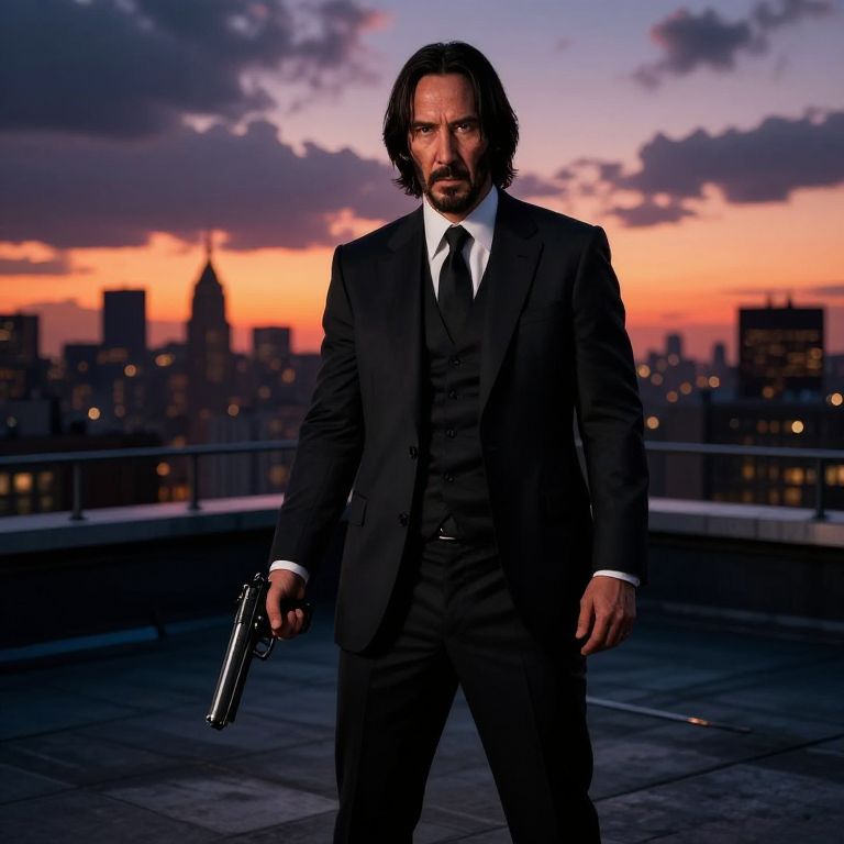 John Wick holding pistol while standing on a rooftop at dusk, city skyline behind him glowing with sunset hues, dramatic clouds, sleek and stylish appearance, cinematic lighting with bold shadows and highlights, ultrarealistic rendering