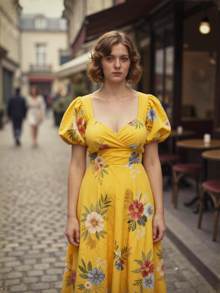 Photograph of a young white woman with wavy brown hair standing on a cobblestone street in an urban European setting. She wears a bright yellow, floral-patterned dress with puffed short sleeves and a deep V-neck. The dress features large flowers in red, blue, and white. She has a fair complexion and a neutral expression. The background shows blurred pedestrians and buildings with red awnings, suggesting a street lined with cafes or shops. The street is slightly out of focus, emphasizing the subject. The image has a soft, slightly vintage filter, adding a nostalgic feel.
