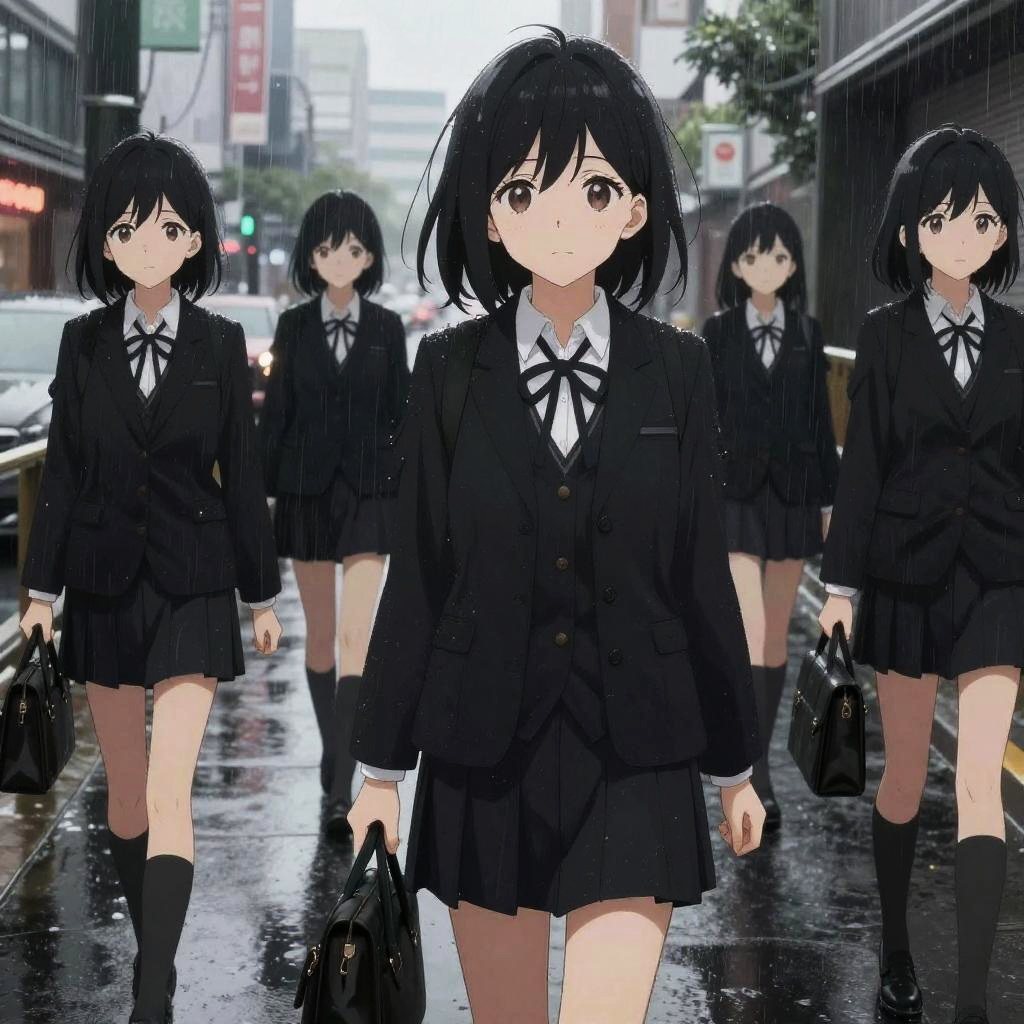 Anime girls black aesthetic, featuring a group of characters wearing black school uniforms with subtle variations, in a rainy urban street scene, wet surfaces reflecting city lights, dramatic weather effects, high resolution anime illustration style.