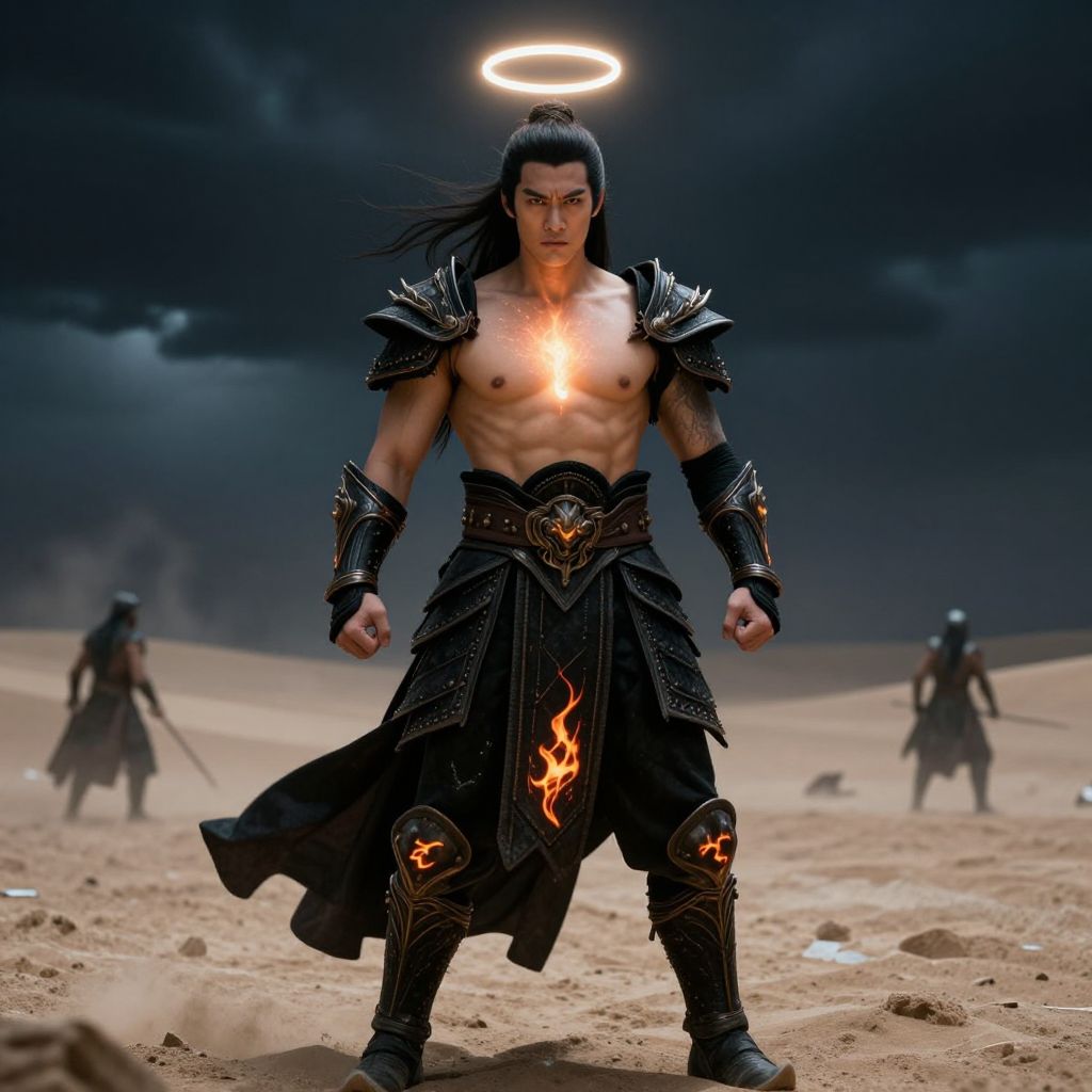 Digital artwork depicting a muscular, Asian male warrior with long black hair, standing in a desert under a dark, stormy sky. He has a glowing halo above his head and a fierce expression. He is shirtless, showcasing a glowing chest emblem, and wears black, ornate armor with fiery designs on his knees and waist. His black skirt-like armor flows in the wind. In the background, two shadowy figures with glowing halos and swords stand on dunes. The sandy desert has scattered debris. The overall style is epic fantasy with dramatic lighting and dark, moody colors.