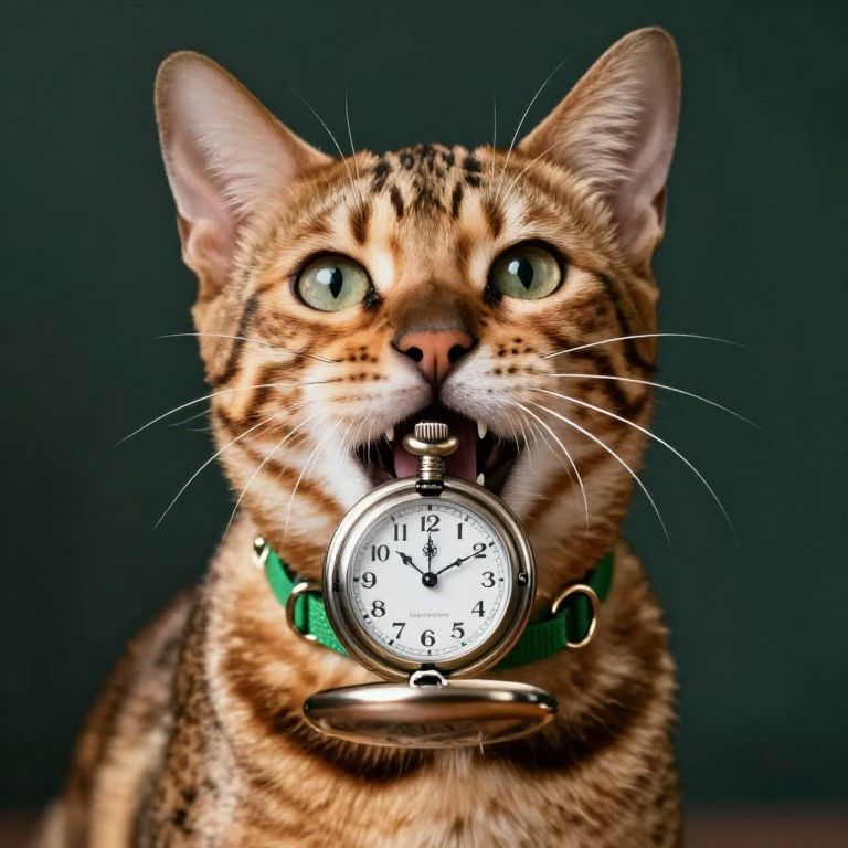 A Bengal cat, adorned with a green collar featuring metallic rings, proudly displays a vintage-style pocket watch clutched beneath its chin, its mouth agape in a playful expression as if announcing the passage of time with enthusiasm.