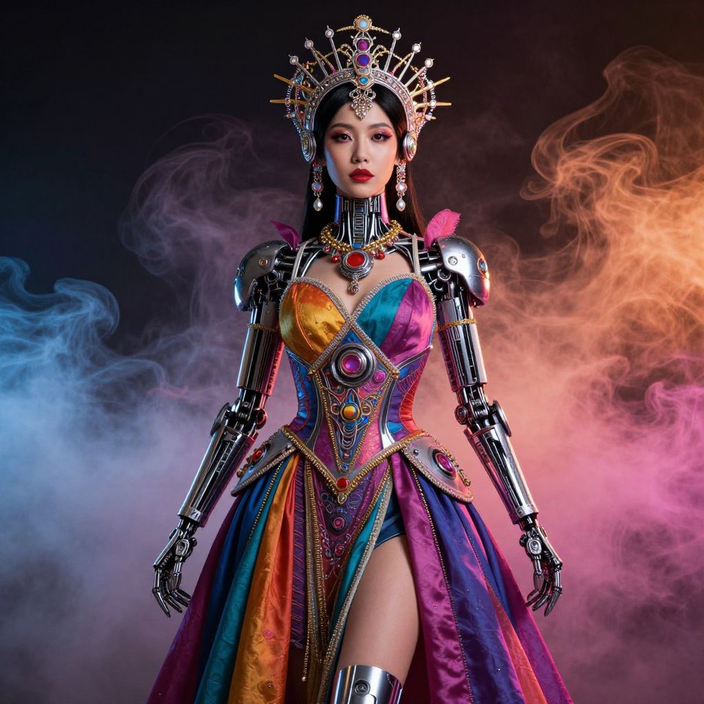 A digital artwork of an Asian woman with fair skin, wearing a metallic, robotic armor dress with vibrant, multicolored, iridescent fabric. She has a tall, ornate crown with jewels and a red gem in the center. Her black hair is styled straight, and she wears red lipstick. The background is a smoky blend of purple, orange, and blue, adding a mystical ambiance. Her robotic arms and shoulders have a shiny, metallic texture, contrasting with the soft, colorful fabric of her dress. She stands confidently, exuding an aura of regality and futuristic elegance.