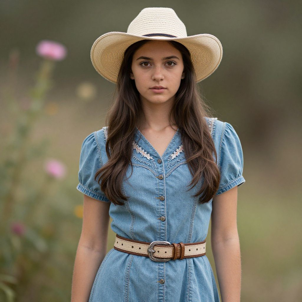 Vintage western dress, 1girl, solo, hat, dress, brown hair, long hair, blurry background, flower, blurry, sun hat, blue dress, outdoors, belt, realistic, looking at viewer, brown eyes, short sleeves