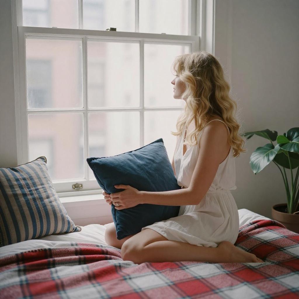 Photograph of a blonde woman with wavy hair, sitting on a bed with red and plaid blankets. She holds a dark blue pillow, wearing a white dress, and looks out a large, sunlit window with frosted panes. Blue-striped pillows are on her left, and a green plant is on her right. Urban buildings are visible outside.