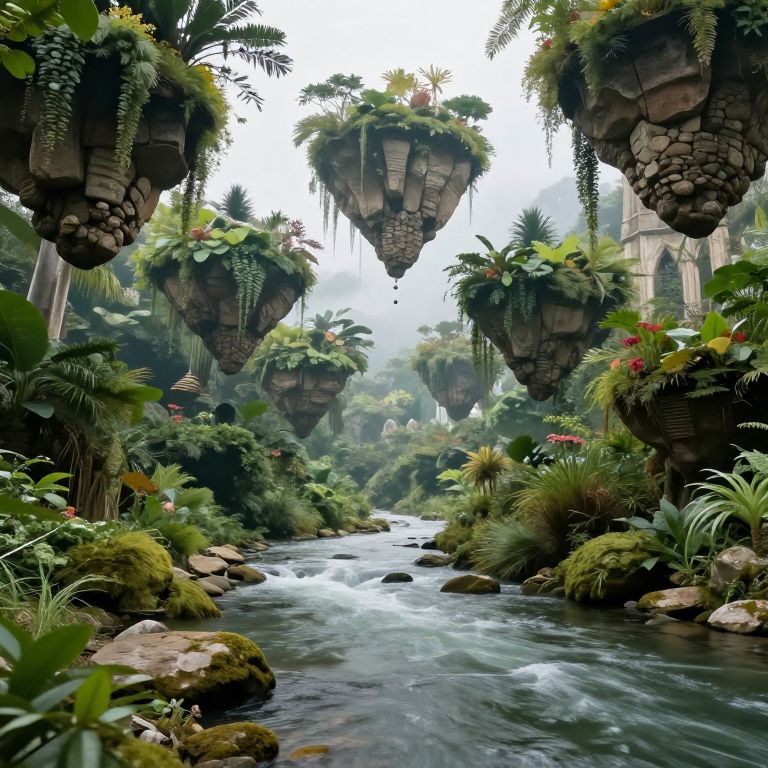 Photograph of a lush, futuristic jungle scene with floating stone platforms resembling hanging gardens. The platforms, adorned with various green plants, vines, and colorful flowers, hang from above a clear, gently flowing stream with rocks on its banks. Tall palm trees and dense foliage line the background, creating a misty, ethereal atmosphere. The sky is overcast, casting a diffused light over the vibrant, verdant landscape. The scene evokes a sense of an enchanted, otherworldly forest, blending natural beauty with imaginative, sci-fi elements.