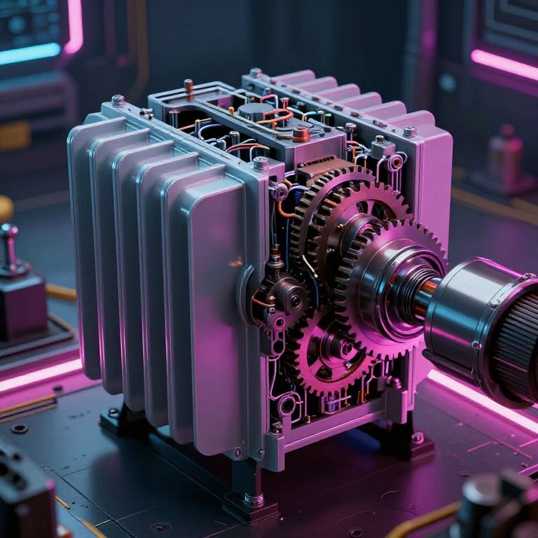 Photorealistic CGI of a futuristic, glowing, metallic engine with pink neon lights, intricate gears, and a cylindrical shaft, set in a high-tech