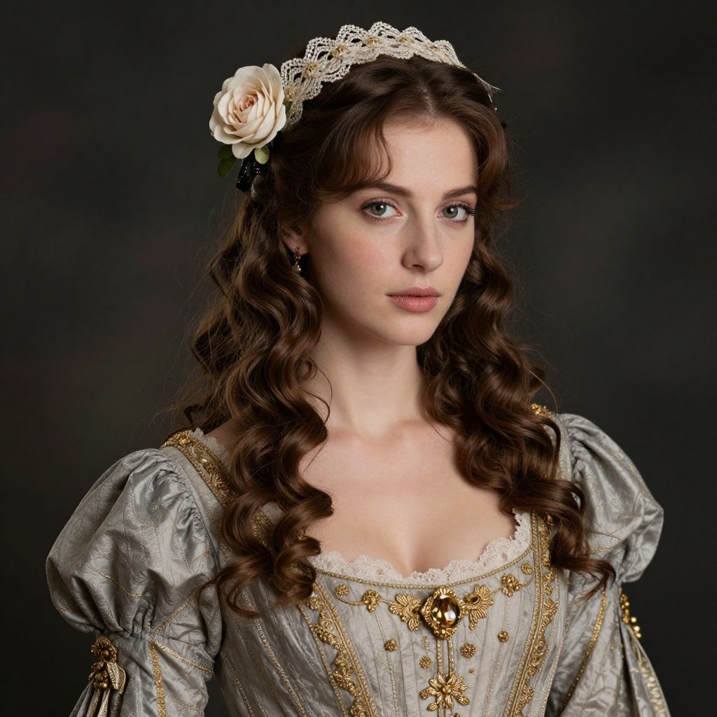 Elegant portrait of a woman with cascading brown curls adorned with a delicate lace headband and a cream rose, wearing a Victorian-inspired dress featuring puffed sleeves, gold embellishments, and a deep neckline, set against a dark, moody background.