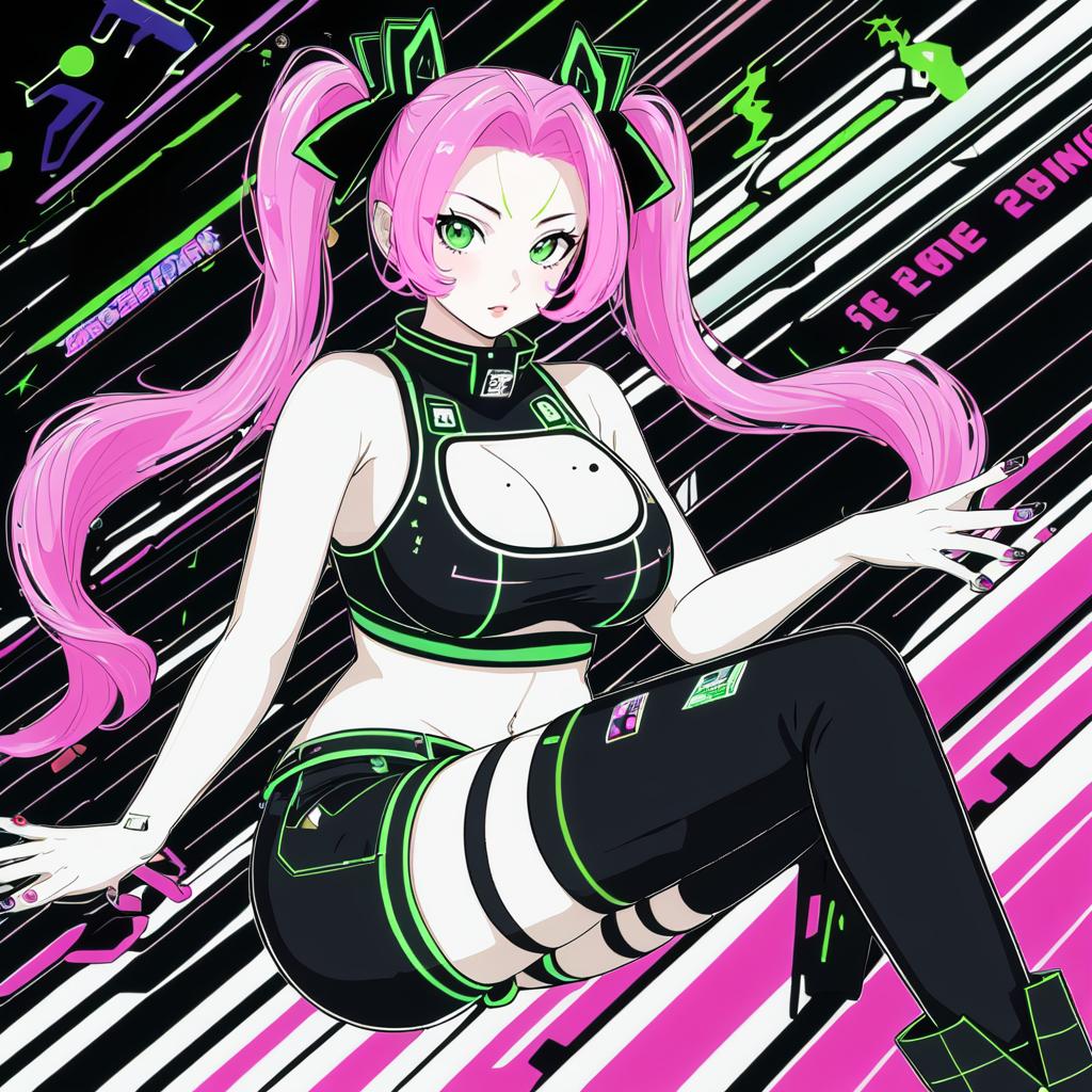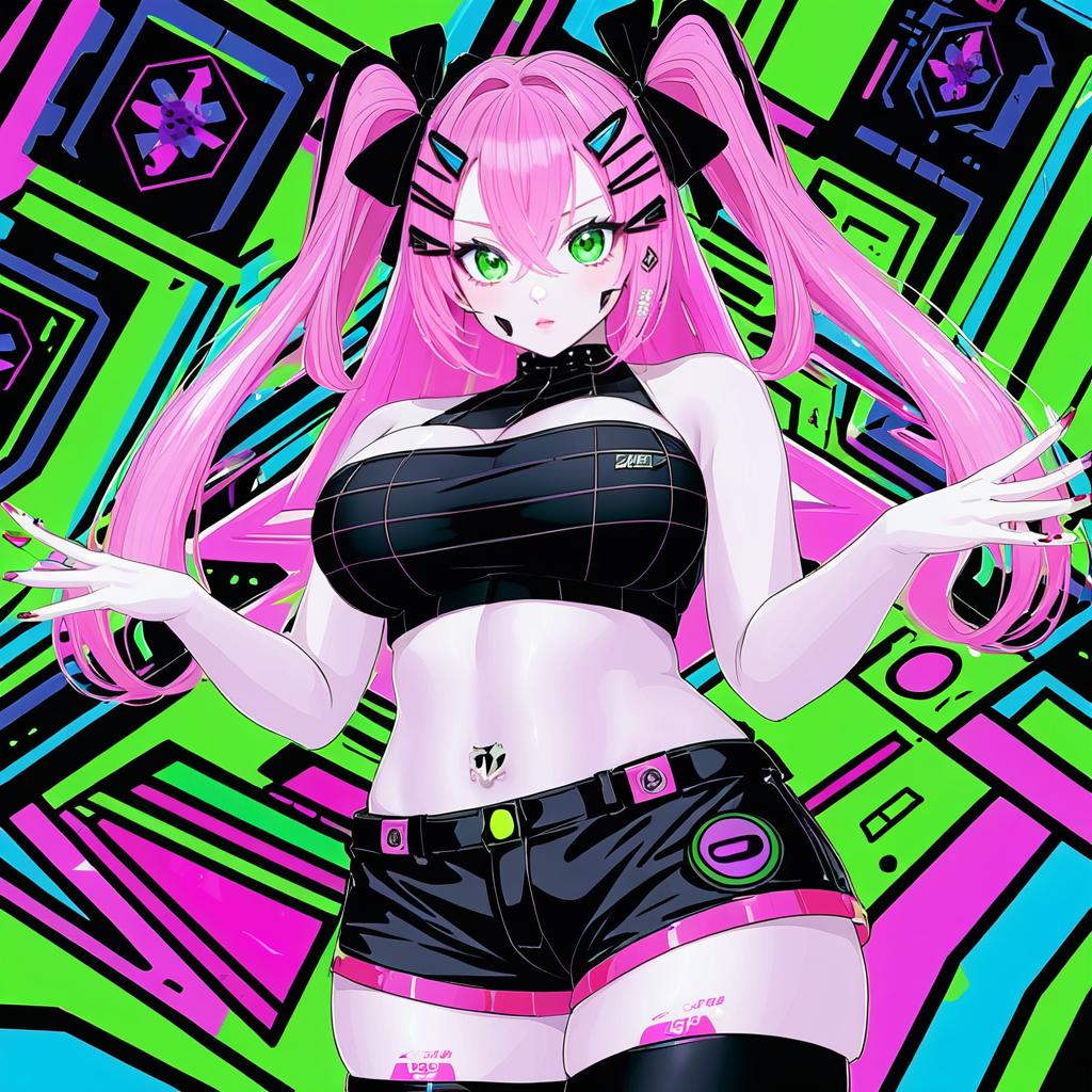 Amillion (zenless zone zero), zenless zone zero, 1girl, green eyes, mole under eye, pink hair, long hair, two side up, hair ribbon, hairclip, large breasts, mole on breast, cleavage, thighs, navel, black thighhighs, black shorts, black ribbon, bare shoulders, nail polish, pink nails, crop top, midriff, by artist mame1645, anime