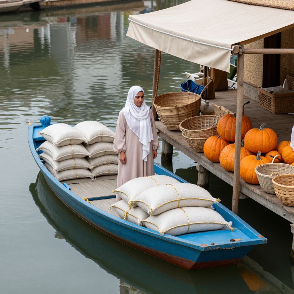 A serene canal scene unfolds as a woman in a flowing hijab stands aboard a rustic blue boat laden with neatly stacked sacks tied with golden twine, gently docking alongside a wooden riverside market where vibrant pumpkins and woven baskets rest beneath a traditional awning, reflecting a tranquil blend of commerce and tradition.