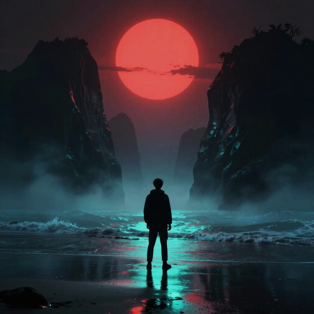 This digital art piece features a dramatic, neon-lit scene of a lone figure standing on a misty beach at night. The person, silhouetted in black, faces towering, shadowy rock formations under a glowing, red circular halo in the sky. The vibrant teal mist and reflections on the wet sand create a surreal, sci-fi atmosphere. The overall mood is mysterious and otherworldly.