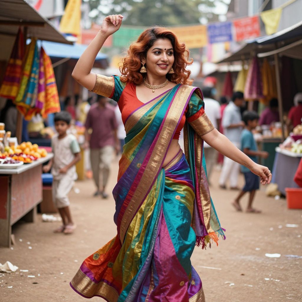 A playful and lively woman in her late 20s with curly auburn hair and a warm smile dressed in a colorful silk saree dress as a costume, dancing in a bustling festival market in a South Indian village, surrounded by colorful fabrics, food stalls, and children playing in the background.. The woman has big tits and cute face