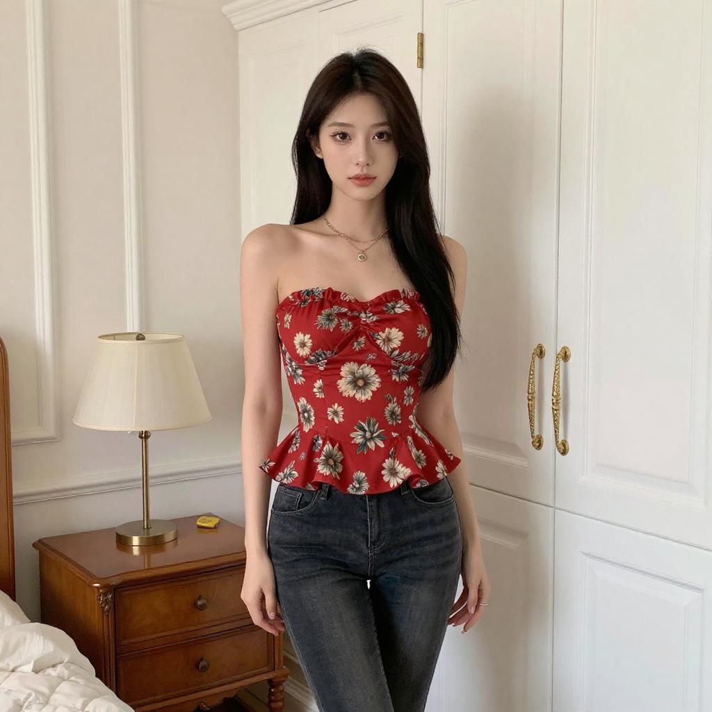 A photograph of an Asian woman with long black hair, wearing a pink and white tie-dye crop top and matching joggers, taking a mirror selfie. She has a fair complexion, red lipstick, and a gold necklace. She sits on a bed with white sheets, holding a pink phone with a patterned case.