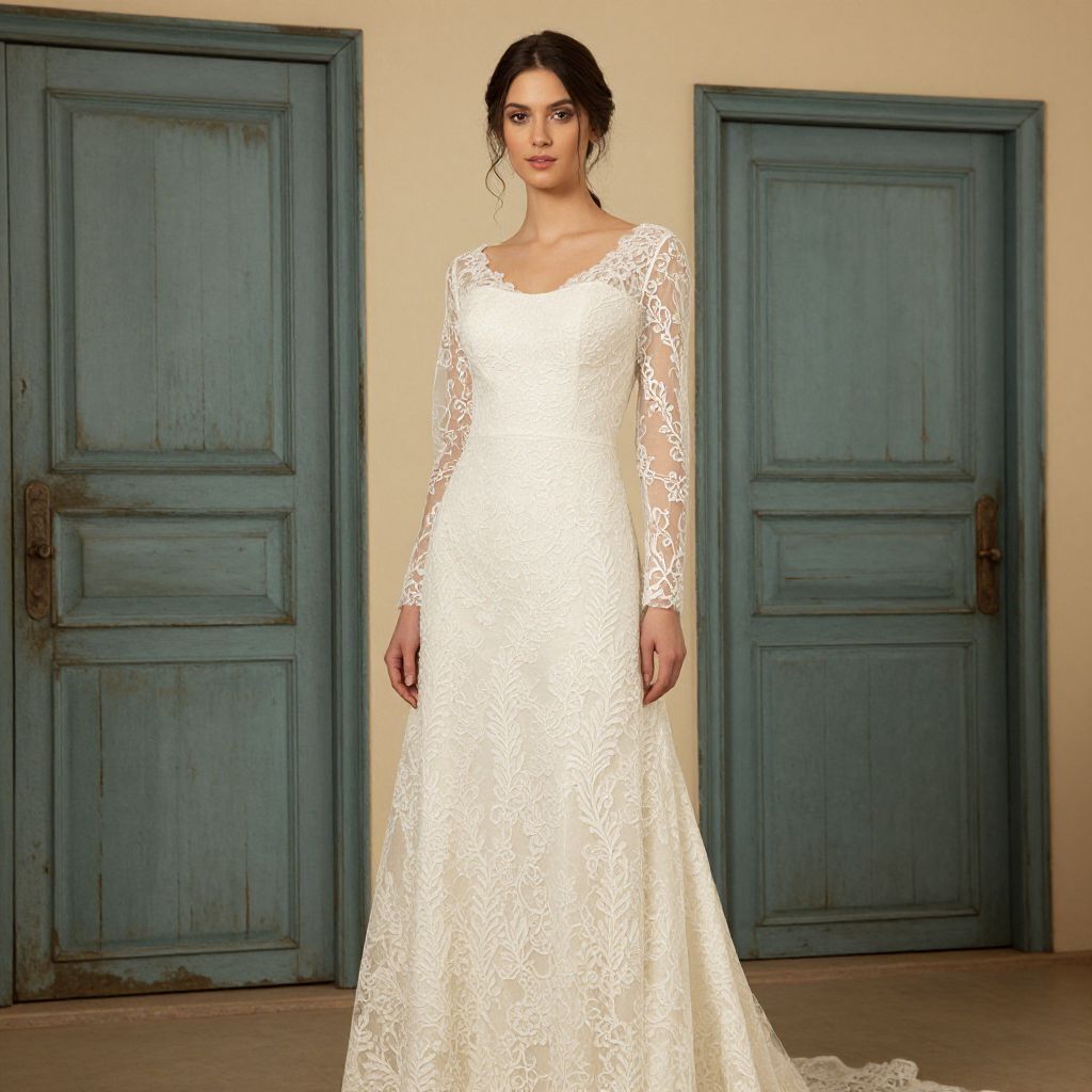 Photograph of a young woman with fair skin and dark brown hair in a loose updo, wearing a long-sleeved, white lace wedding dress with a round neckline. She stands in front of two rustic, blue wooden doors with metal handles, set against a beige wall. The lace dress features intricate floral patterns and a full, flowing skirt. Her expression is neutral, and she stands centered, with her arms relaxed by her sides. The lighting is soft, highlighting the texture of the lace and the worn finish of the doors.