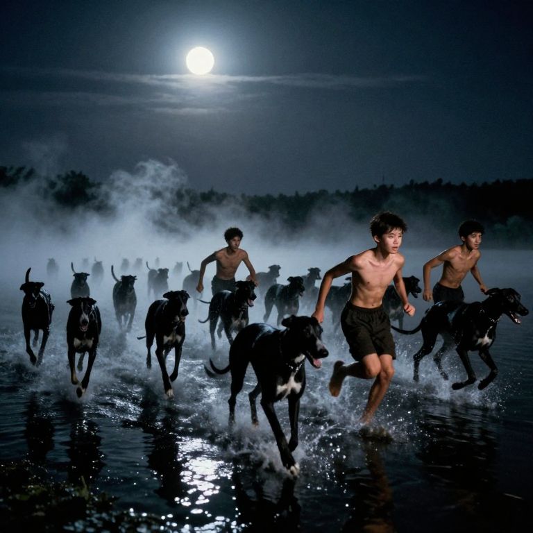In this dramatic scene, a horde of black Greyhounds, numbering at least ten, are captured in mid-run across a pool of black water, creating a misty trail behind them. Three 16-year-old boys, with muscular torsos, are seen running alongside the dogs, their faces illuminated by violent white lighting that contrasts sharply with the moonlight. The boys are positioned in the foreground, with the dogs following closely behind. The setting is a dark, foggy night, with an endless horizon in the distance, adding to the sense of depth and scale. The overall composition is dynamic, with the subjects arranged in a diagonal line that leads the viewer's eye from the foreground to the background, creating a sense of movement and urgency. The interplay of colors, textures, and shapes is striking, with the black of the dogs and boys standing out against the dark water and the contrasting white lighting. The film grain and 35mm effect add a vintage, almost cinematic feel to the image, while the use of a strobe light enhances the dramatic effect.