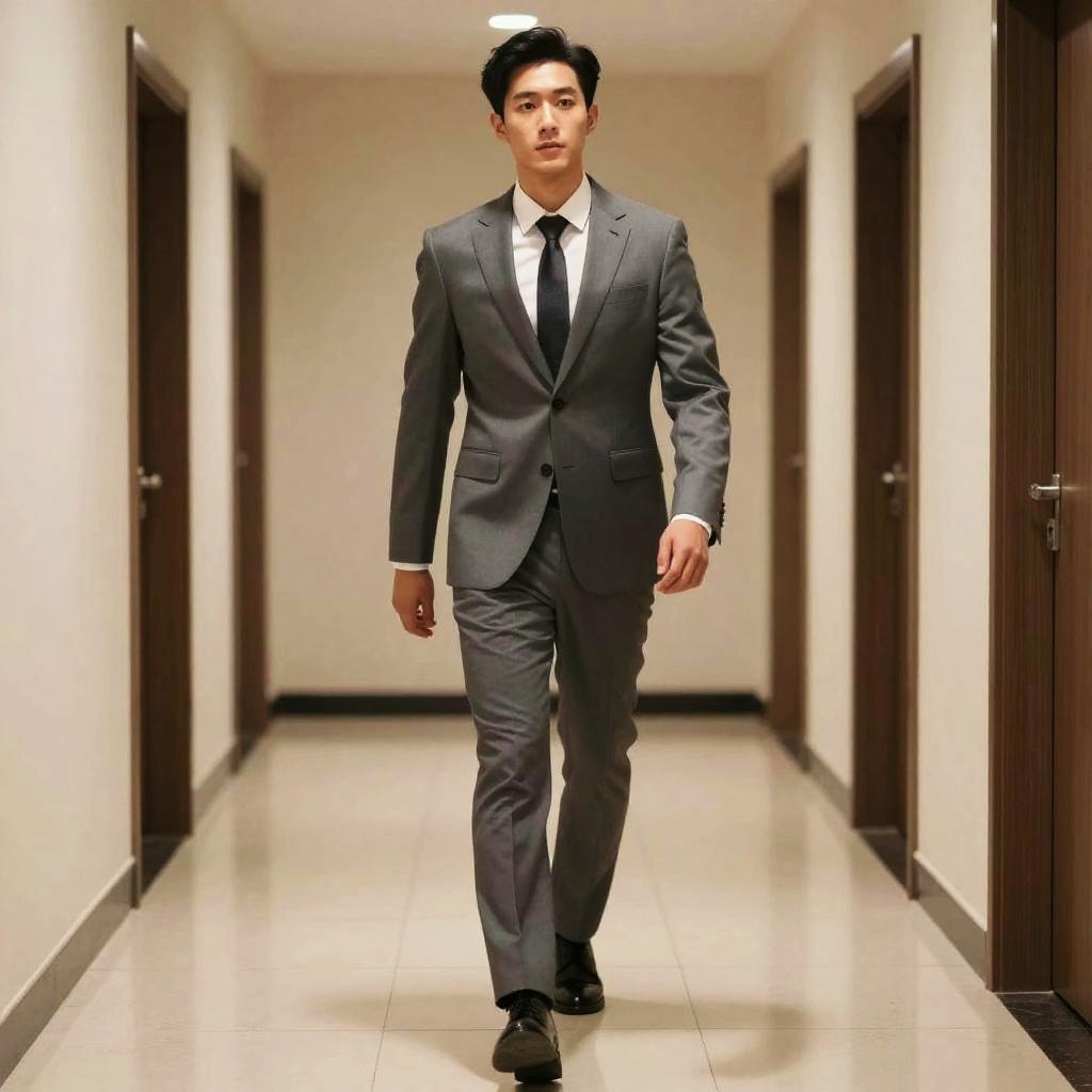 Photograph of an Asian man with short black hair walking down a brightly lit, narrow hallway with beige walls and brown doors on either side. He is wearing a sharp, dark gray suit with a white dress shirt and black tie. His expression is neutral, and he is looking straight ahead. The floor is polished cream-colored tile, reflecting the overhead lighting. He is in the center of the frame, walking directly towards the camera. The overall style is modern and professional.