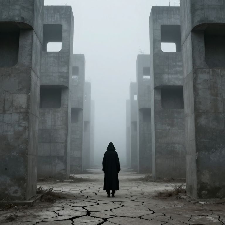Silhouetted figure in a hooded cloak walks down a misty, cracked concrete corridor between tall, rectangular, windowless buildings. Photoreal