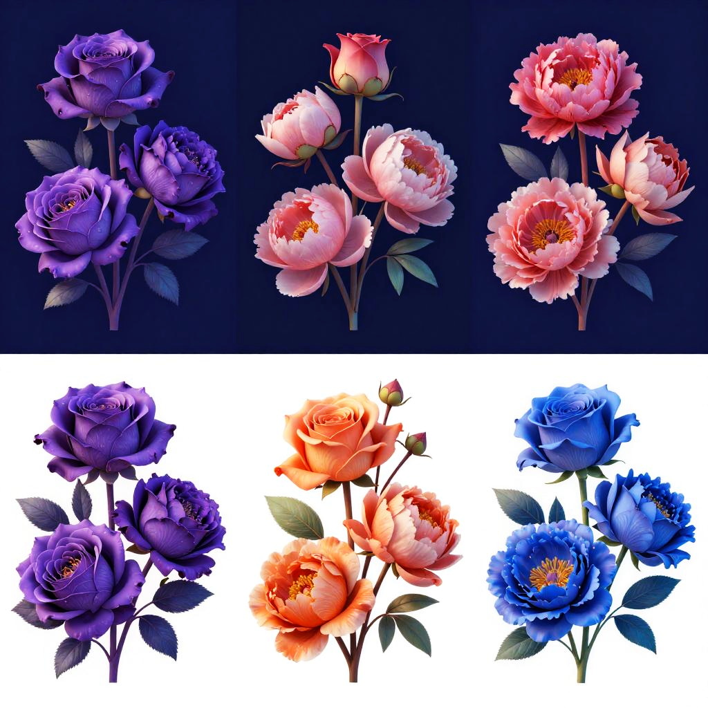 This image is a digital collage of eight vertical floral arrangements, each featuring a mix of colorful roses and peonies. The top row has dark blue backgrounds, while the bottom row has white backgrounds. The flowers include shades of purple, pink, orange, and blue, with green leaves. The digital art style is vibrant and slightly surreal, with a focus on rich, contrasting colors.
