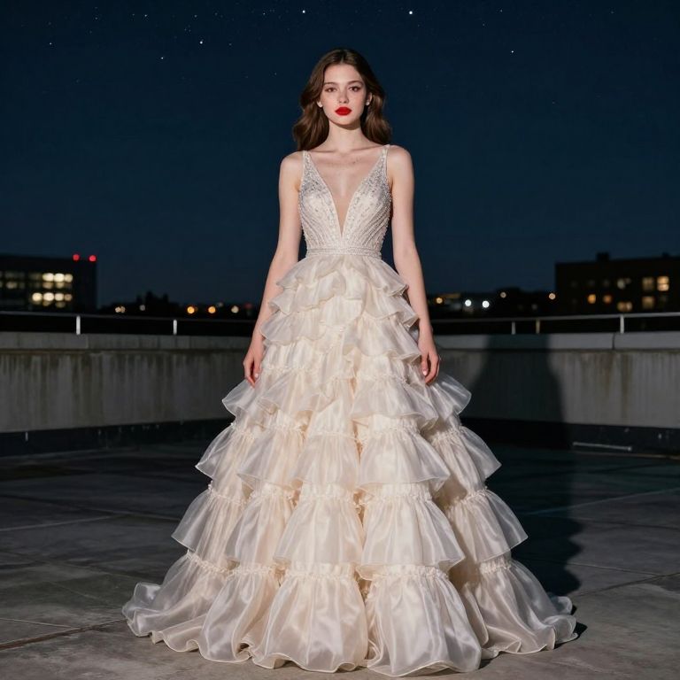 Photograph of a brunette woman in a white, deep V-neck, multi-layered ruffled ball gown, standing on a rooftop at night.