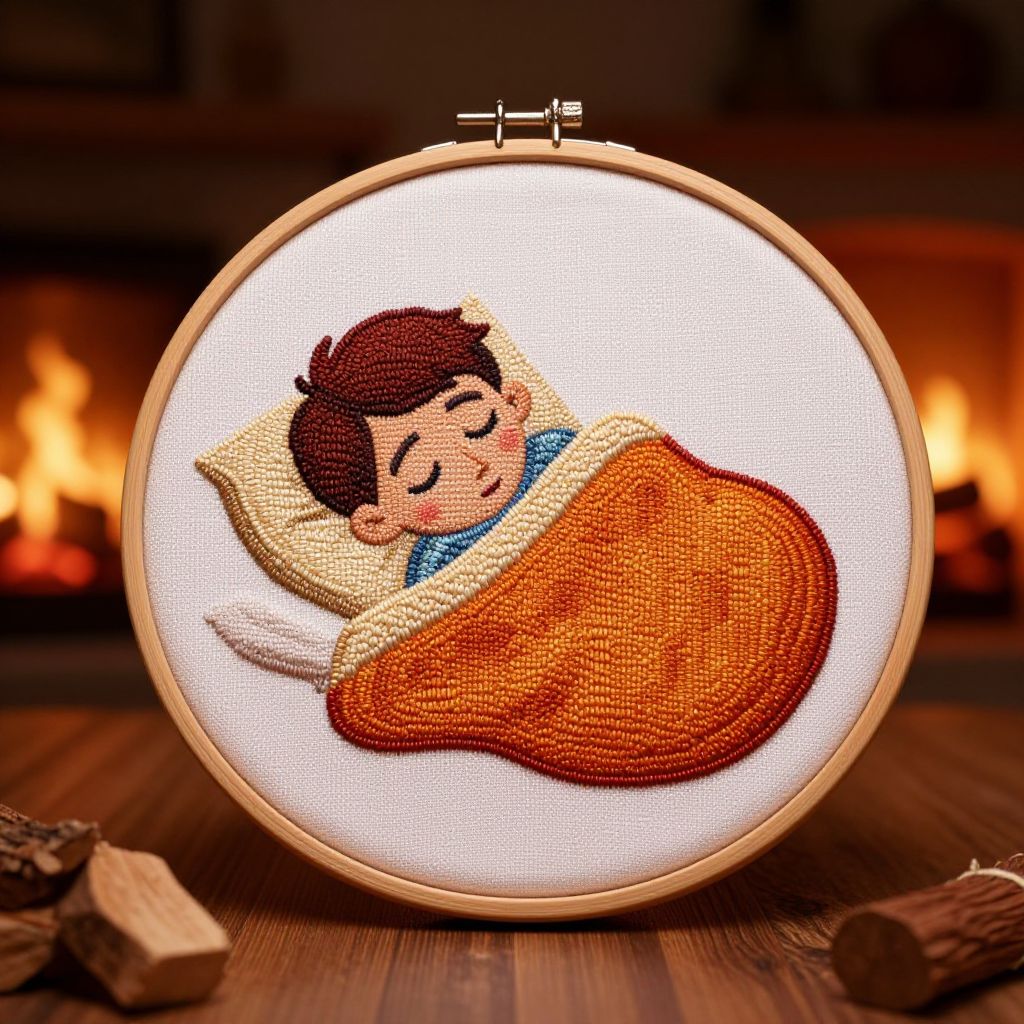 Embroidery Frame Cartoon man, sound sleep, cozy bedroom, warm blankets, firewood, fireplace, peaceful slumber, gentle warmth, dimly lit, inviting ambiance, 8k HD,