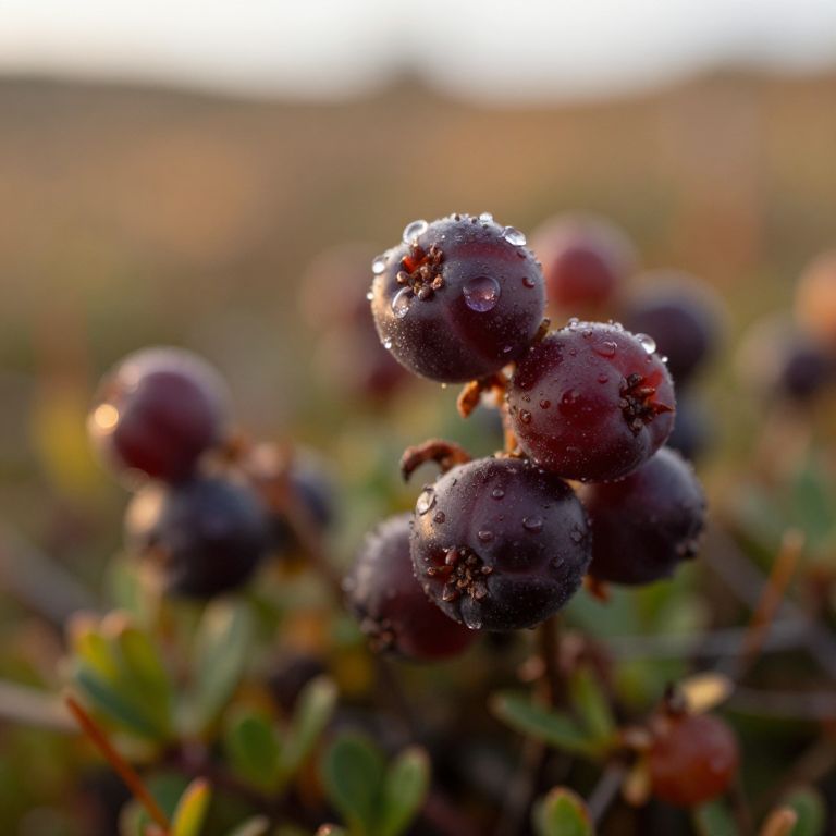 Macro shot of ripe cloudberries clustered on thorny bushes, wet from early dew, with soft bokeh background of wild tundra, photorealistic style emphasizing natural beauty and organic textures, warm golden light