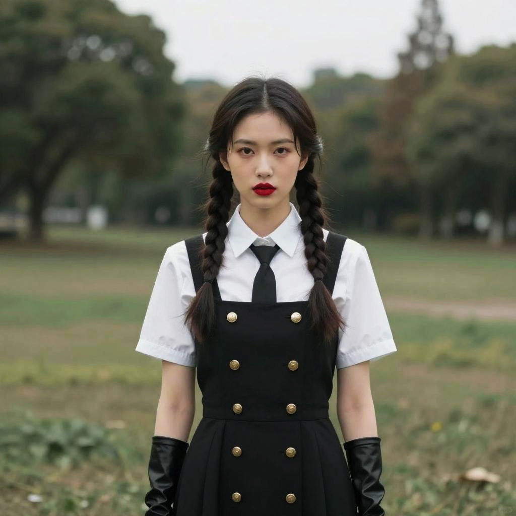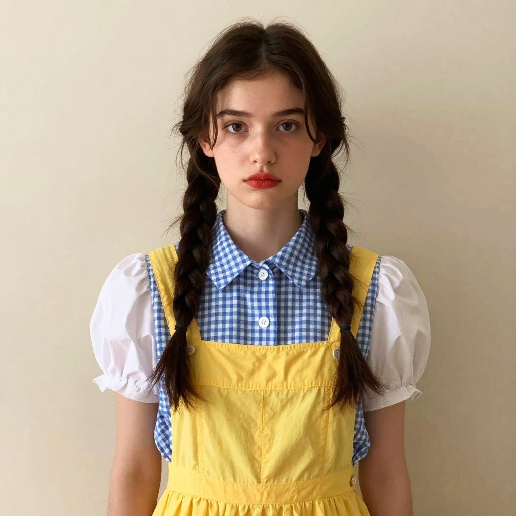 Photograph of a young woman with fair skin and dark brown hair in two braids, wearing a yellow pinafore dress over a blue checkered blouse with white puffy sleeves. She has red lipstick and a slightly serious expression. The background is a plain, beige wall, and the lighting is bright, highlighting her features and outfit.