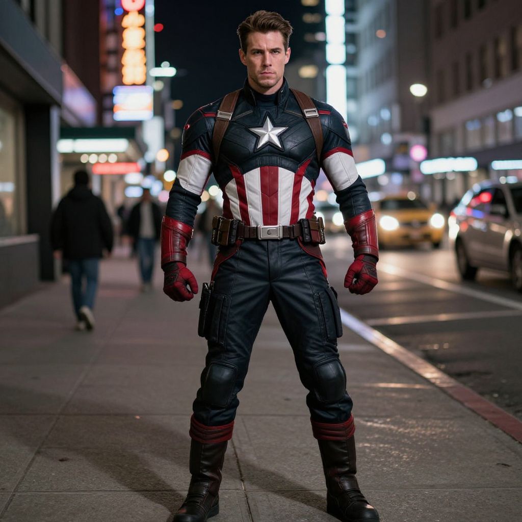 Photograph of a muscular man in Captain America's costume standing confidently on a neon-lit city street at night.