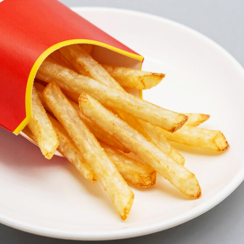 A close-up photo of a bag of crispy, golden French fries spilling out onto a white plate. The bag is red with a yellow rim and is positioned in the top left corner. The fries are thin, slightly curved, and have a crunchy texture. The background is mostly white with a gray border on the top and bottom.