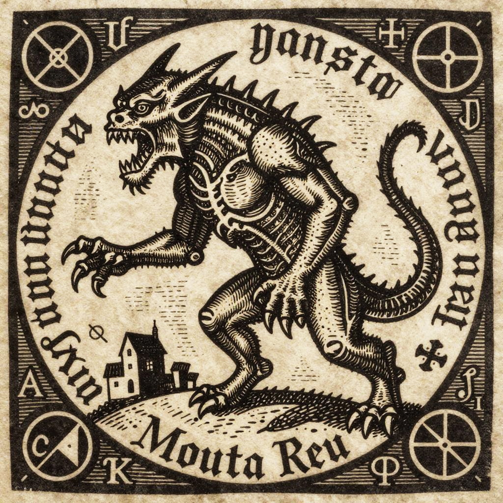 Intricate medieval demon woodcut depicting a monstrous creature with sharp teeth and spiked tail, encircled by medieval script and alchemical symbols, utilizing traditional chiaroscuro effects and rough woodcut engraving style to create a dark mythological scene.