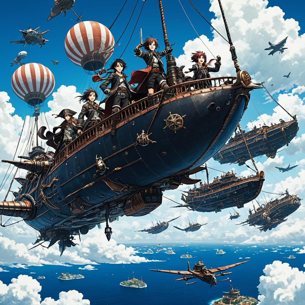 A fleet of sky pirates, each with weathered leather gear and sky-themed tattoos, striking dramatic airborne poses on flying ships, in an expansive sky filled with floating islands and airships, depicted in the dynamic and empowering anime style of Jitsuna Kamikita.