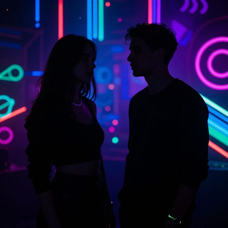 Two silhouetted figures stand against a vibrant backdrop of neon lights and abstract shapes, capturing the essence of a cyberpunk-inspired black light UV party with dramatic lighting and high-definition visual effects.