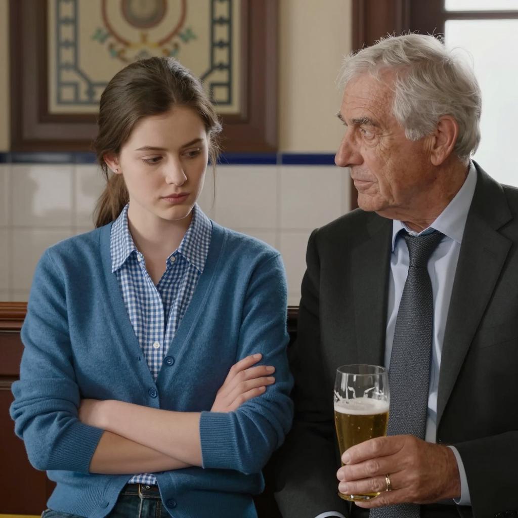 Two people sit at a wooden table in a retro room. A woman with long brown hair, wearing a white bathrobe, rests her head on her hand, drinking from a white cup. A man with short gray hair, in a black polo shirt and gray pants, sits with a concerned expression. The table has a yellow mug, an old radio, and various small items. The background features patterned wallpaper and a framed picture. The man wears a wristwatch. Both chairs are upholstered in pink fabric.