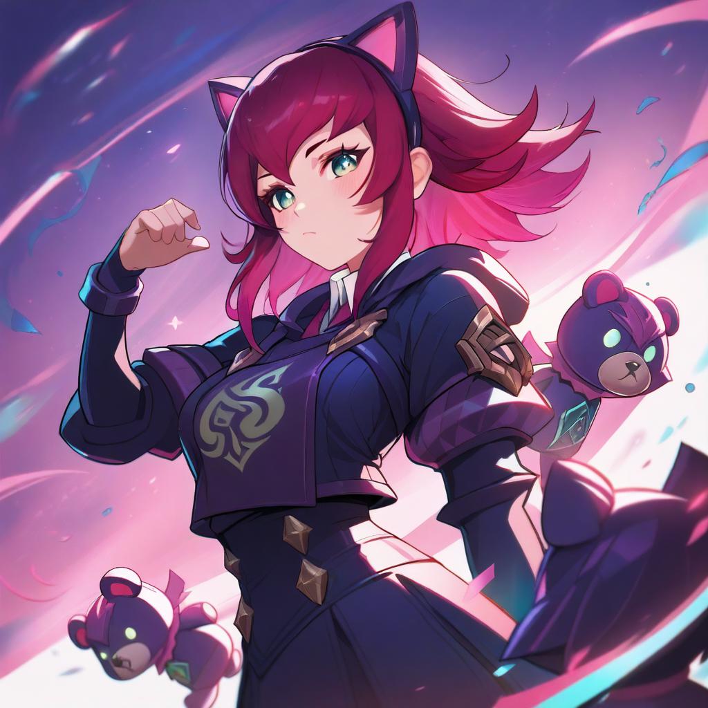 Digital anime-style illustration featuring a girl with short pink-red hair and bright green eyes. She wears prominent cat ears, a dress with a white collar and bow, fingerless gloves, and stands against a background of multicolored angry teddy bears. The character is designed in a style inspired by the game League of Legends, particularly resembling the champion Annie. The artwork uses bold outlines and vibrant colors, highlighting the contrast between the cute girl and the ominous teddy bears.