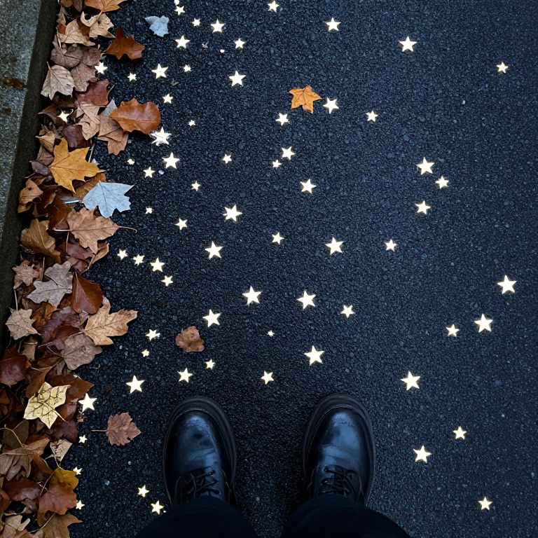 Photograph of a textured black asphalt ground adorned with white stars of varying sizes. The top left corner features a scattered arrangement of colorful autumn leaves in shades of orange, yellow, and brown. At the bottom of the image, a person's feet, clad in shiny black sneakers, are visible. The contrast between the dark asphalt, bright stars, and vibrant leaves creates a whimsical, starry night effect. The image is taken from a top-down perspective.