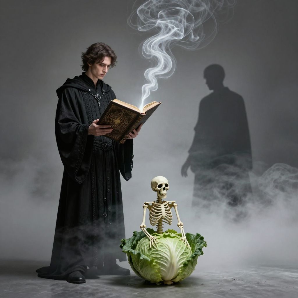 Photograph of a dark-haired man with pale skin, wearing a black, long-sleeved, hooded robe, standing and reading a book emitting swirling white smoke. In front of him is a green cabbage with a skeletal figure sitting on top, surrounded by leafy greens. The background is a misty, grey gradient, and the man's shadow is cast behind him. The image has a gothic, mystical atmosphere with a mix of eerie and surreal elements. The textures include the man's robe's intricate fabric and the cabbage's rough surface.