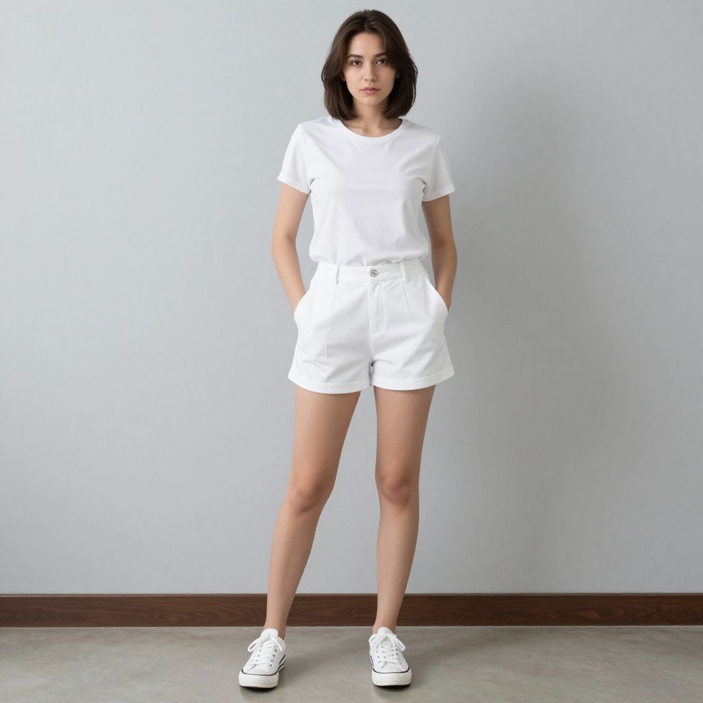 Photograph of a young woman with fair skin and shoulder-length dark brown hair, standing against a plain white wall. She wears a white short-sleeve t-shirt and matching white shorts with a drawstring, and white low-top Converse sneakers. Her hands are casually tucked into the pockets of her shorts. The floor is a smooth, light gray concrete, and the baseboard is dark brown. She stands with a relaxed, confident posture, looking directly at the camera with a neutral expression. The overall style is minimalist and casual.