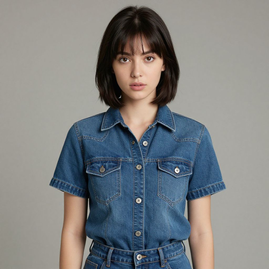 "two piece outfit costume, 1girl, hands in pockets, brown hair, solo, realistic, full body, pants, shirt, short hair, white shorts Realistic photo of casual sexy person with pretty face"