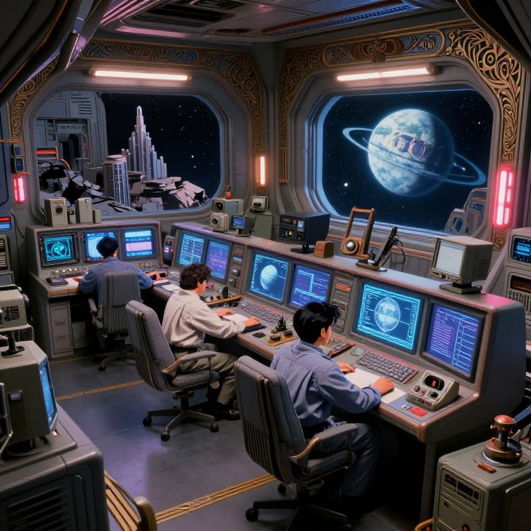 Photograph of a futuristic control room with four men in blue and white uniforms working on complex computer screens, overlooking a window view of a planet with rings