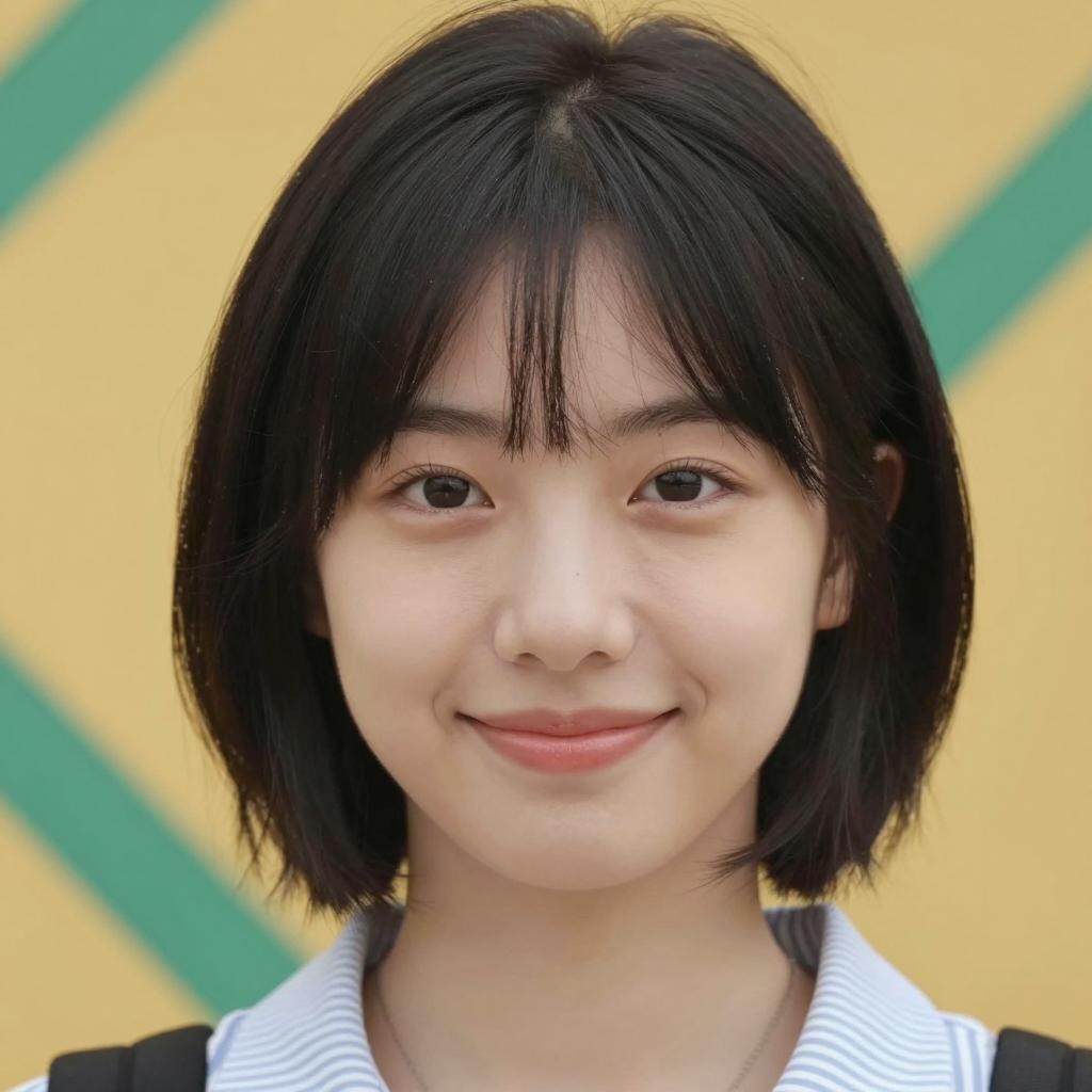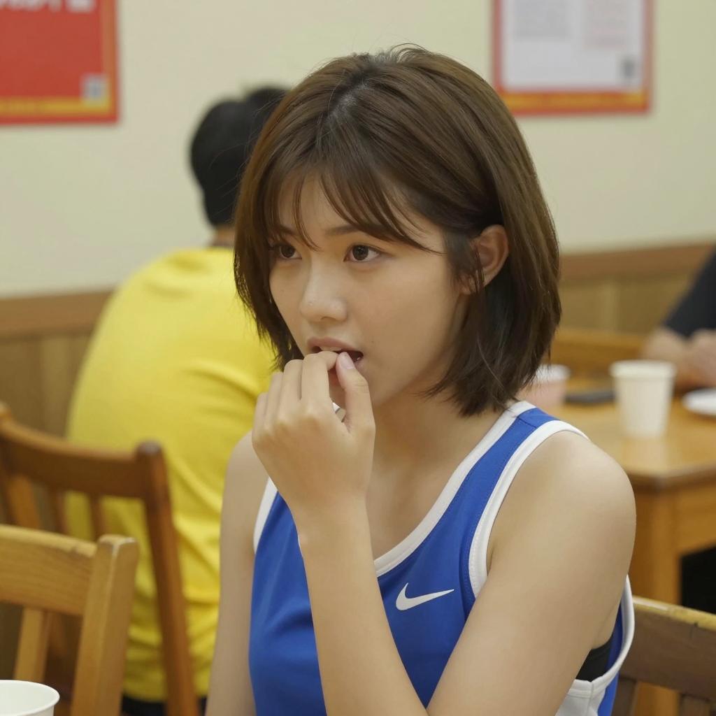 Young woman with short brown hair, wearing a blue and white "Nike" tank top, bites her index finger. Background has a blurred person in yellow shirt. Warm, indoor setting with green walls and red posters. Light brown wooden furniture. White cup on table. Casual, candid moment.