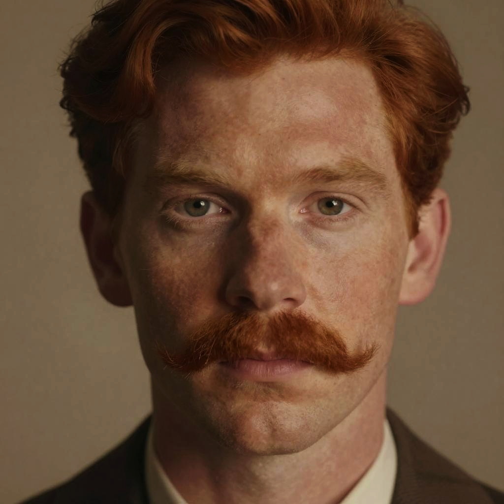 Close-up of a man with distinctive handlebar mustache and chin puff, vintage barbershop setting, warm tones, intricate grooming tools visible, soft natural light