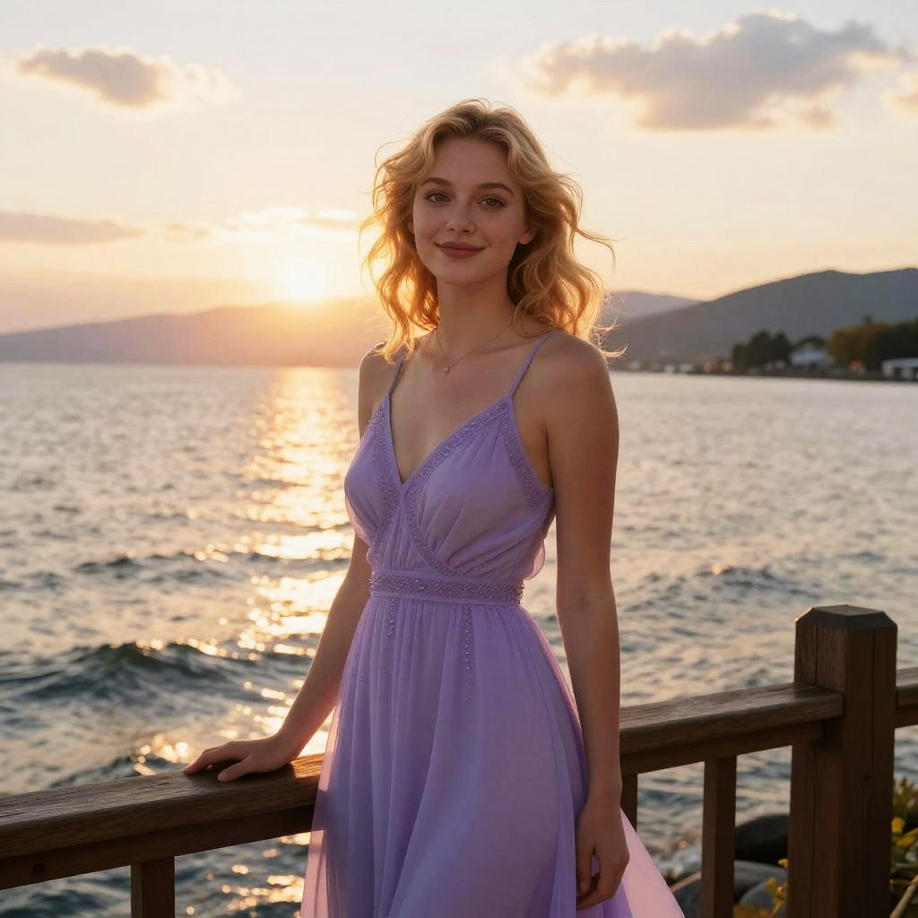 Young Woman by Lake at Sunset