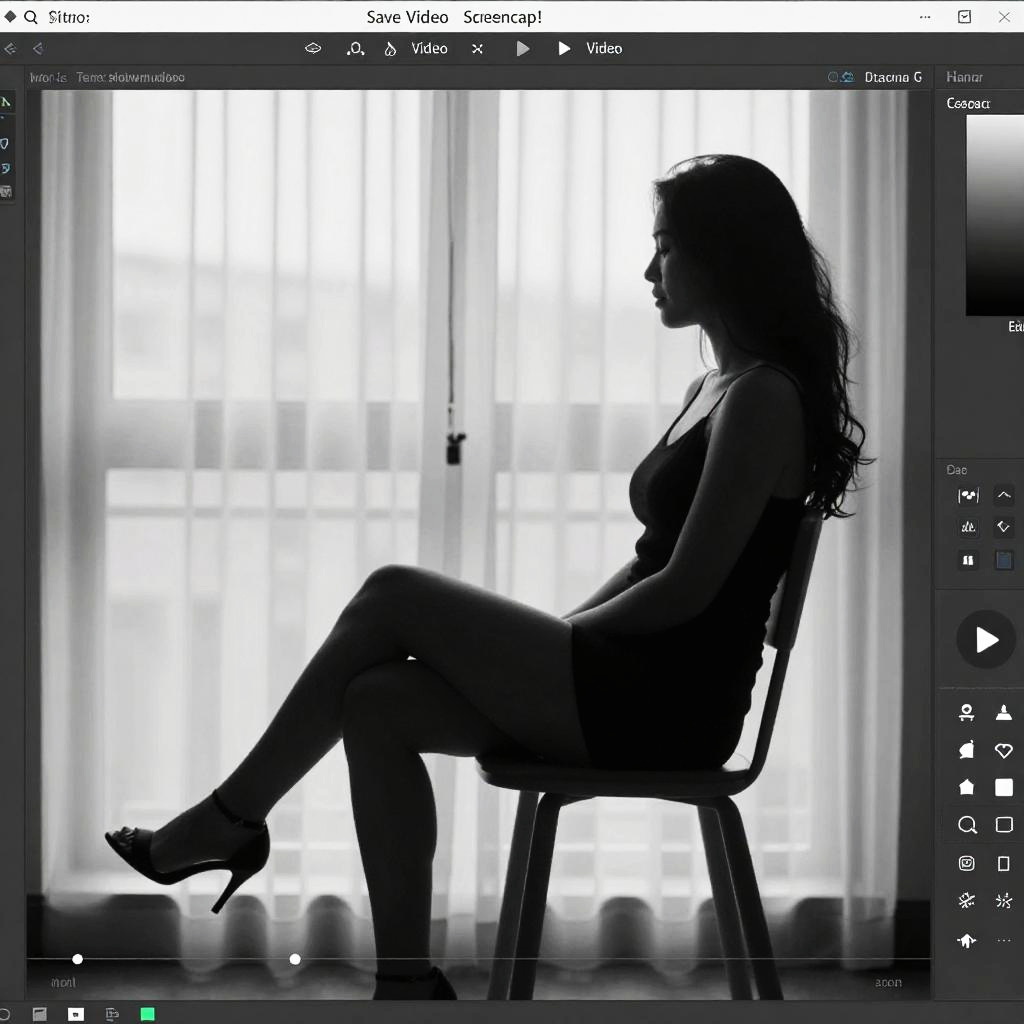 A screenshot of a video editing interface shows a black and white silhouette of a woman with long hair sitting on a chair in front of a window with sheer curtains. The background has soft natural light. The interface includes various editing options like "Save Video and Screencap!" and playback controls. The woman's pose is relaxed, with one leg crossed over the other.