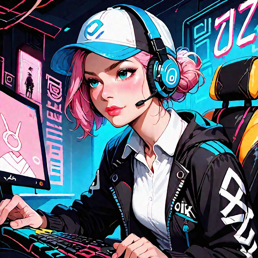 Score_9, score_8_up, score_7_up, score_6_up, score_5_up, score_4_up, owdva, baseball cap, headphones around neck, black jacket, looking at screen, keyboard, gamer chair, neon lights, chill, indoors