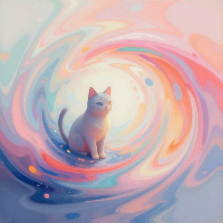 Digital painting of a white cat with a pink nose and tail, sitting in the center of a swirling, colorful vortex. The background features vibrant, abstract swirls of pink, orange, blue, and purple, creating a dynamic, glowing effect. The cat sits with a calm expression, illuminated by a bright, central light that creates a halo around it. The texture is smooth with soft, flowing brushstrokes, and the overall style is whimsical and dreamy. The cat is centrally positioned, with the vortex swirling around it, adding a sense of motion and energy. The colors blend seamlessly, creating a magical, ethereal atmosphere.