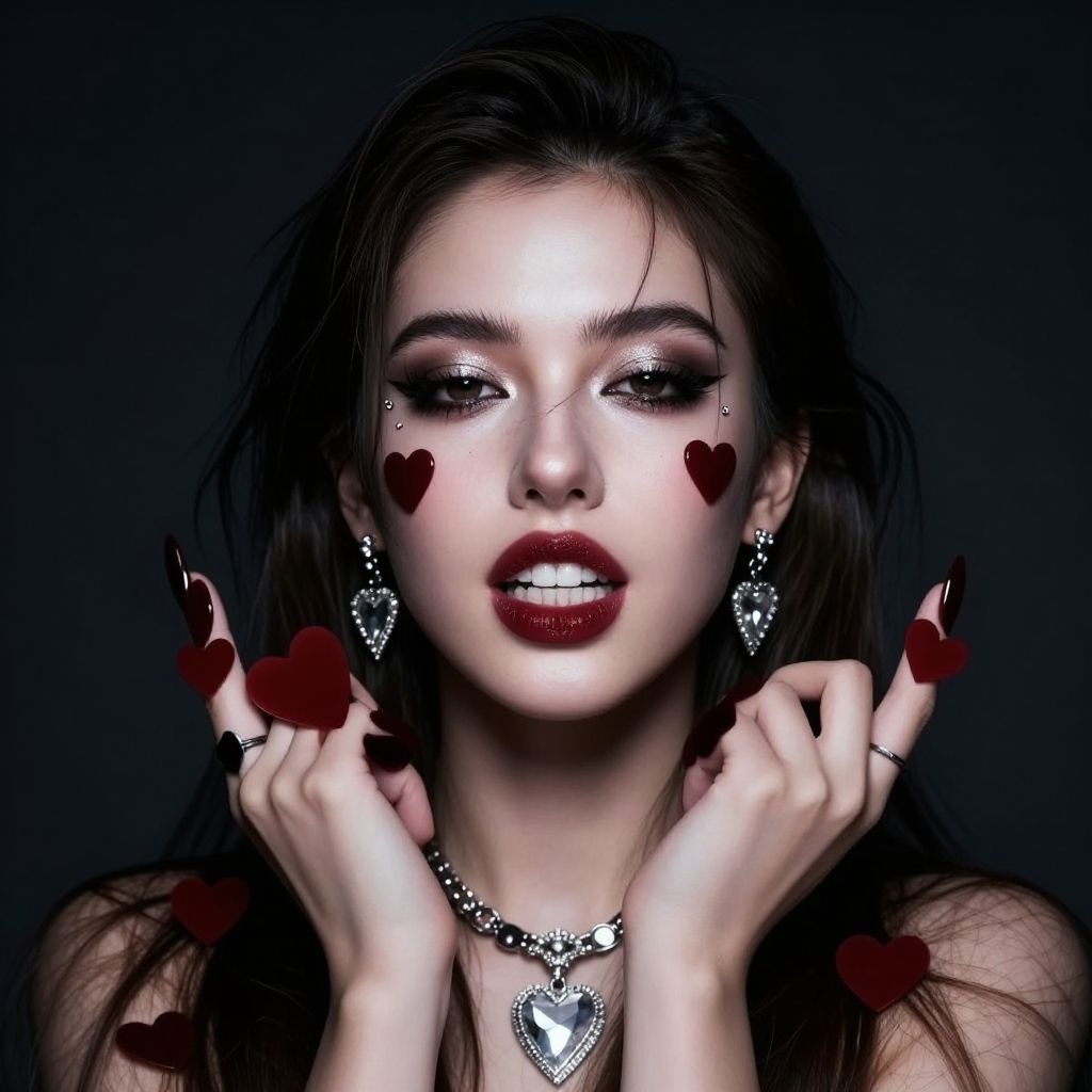 19 years old rich girl, hearts, dark portrait, heavy makeup, photorealistic, diamond face shape, teeth, jewelry, crazy, Greenlandic