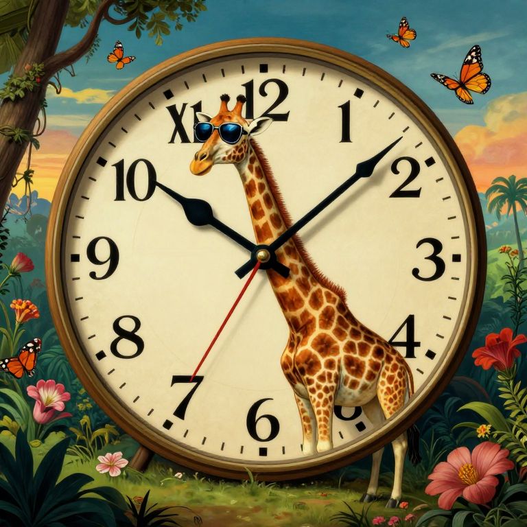 A whimsical digital illustration features a large, round clock with a wooden frame, centered on a vibrant, jungle-like background. The clock's face is white with black numerals and black hands, with the hour hand pointing to 10 and the minute hand at 2. A giraffe with orange and brown spotted fur stands inside the clock, wearing blue sunglasses. Surrounding the clock are colorful flowers, including pink and red blossoms, and green foliage. Bright orange and black butterflies flutter around, and the background showcases a blue sky with orange and pink hues of a setting sun.