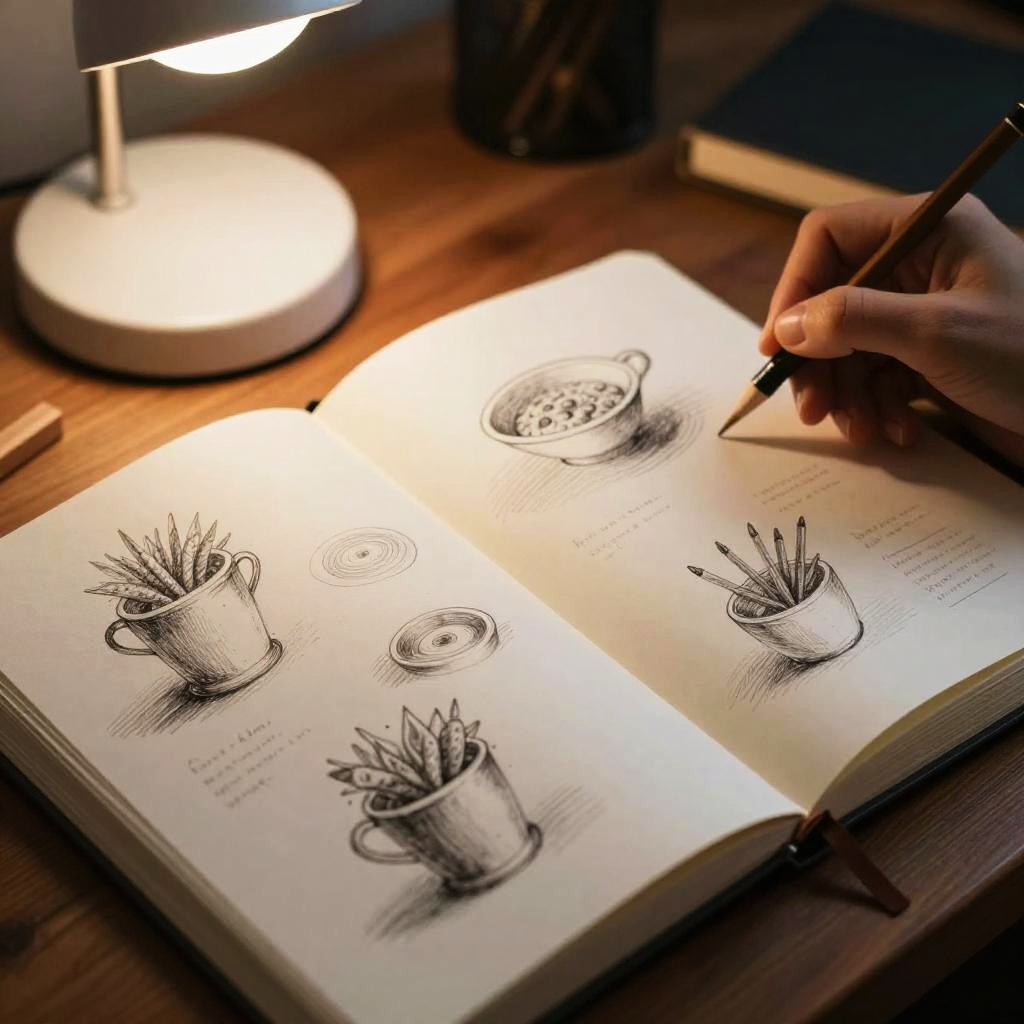 Focused sketch content creator capturing ideas in a sketchbook, late evening with soft desk lamp glow, textured paper and pencil strokes visible, intimate and calm atmosphere
