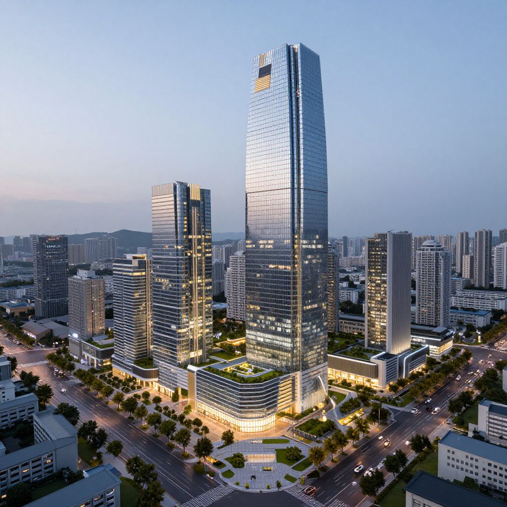3/4m scale architectural model of a modern futuristic cityscape, intricate details, skyscrapers with glass facades, green rooftop gardens, vibrant lighting at dusk, ultra-realistic rendering, wide-angle perspective, soft shadows